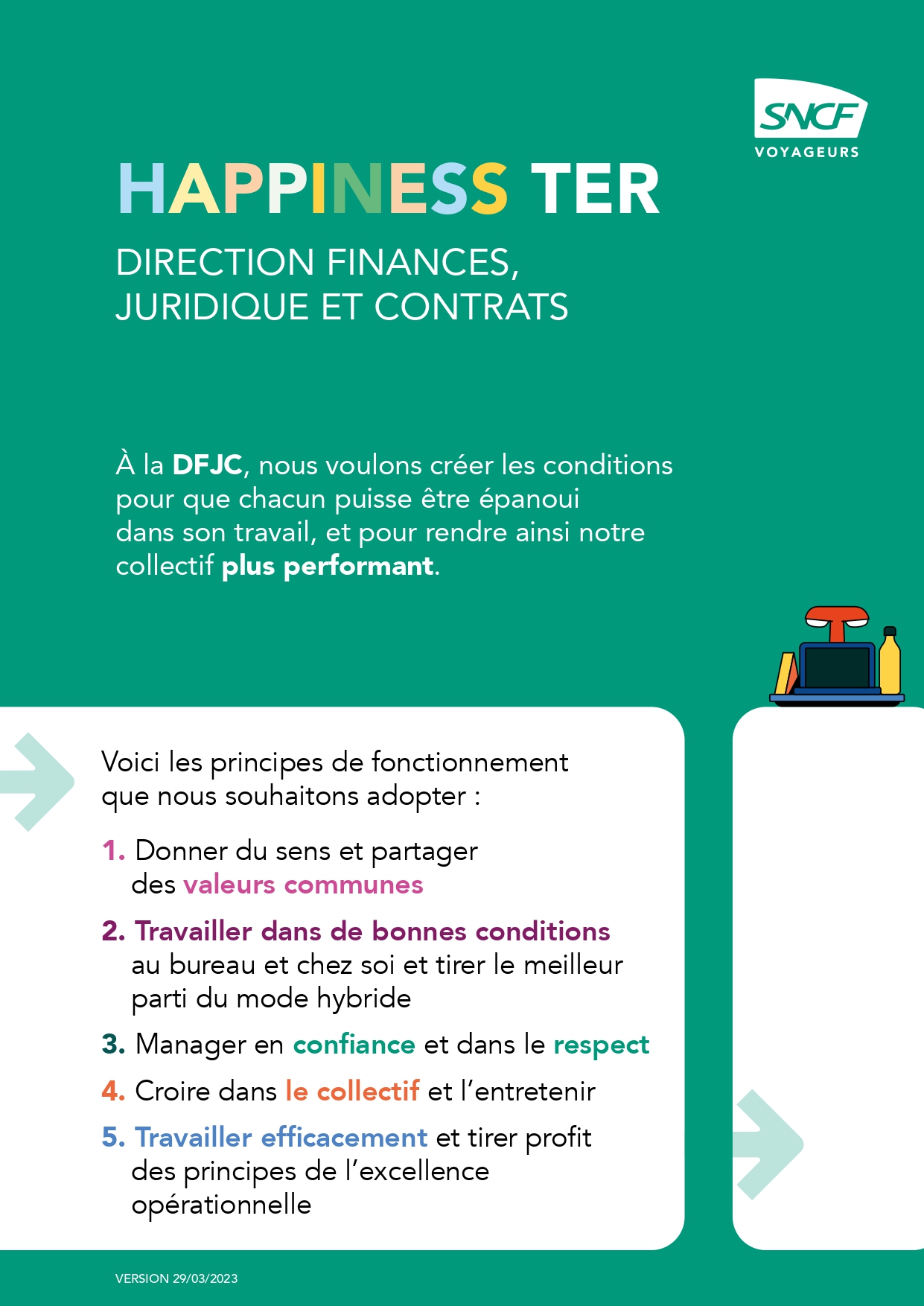 Share Hapiness TERLa charte hapiness TER présente les différentes règle de la DJFC (Direction Juridique des Finances et des Contrats) au sein de la SNCF pour concilier vie personnel et vie professionnelle. Categories:Print Share PrécédentSNCF GamingSuivantLogos entités SNCF