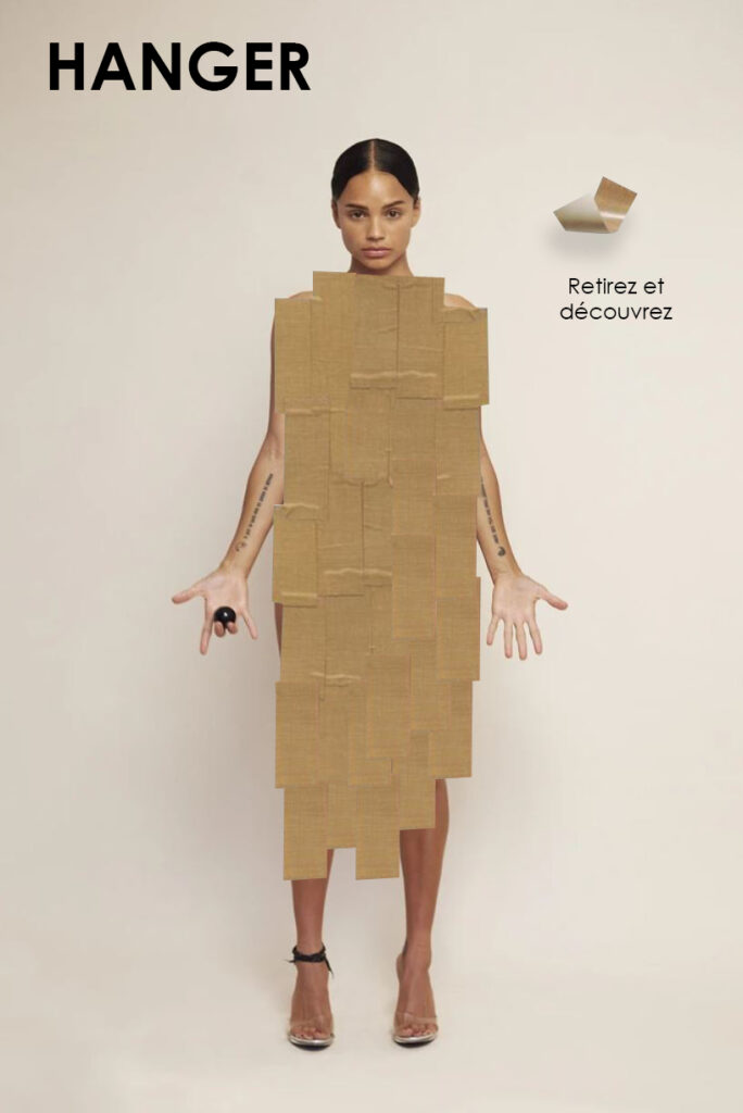 Enfin, la dernière affiche est pour une campagne de street marketing. Les passants sont invités à enlever des bouts de scotch sur une affiche. Croyant que le mannequin est nu, ils seront surpris de découvrir les vêtements en latex de Hanger.